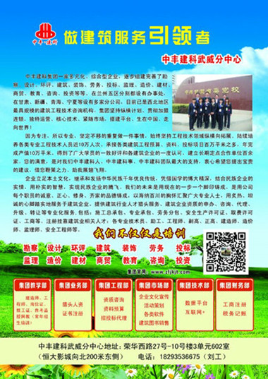 蘭州中豐建科工程技術(shù)中心是一家多元化、綜合型企業(yè),逐步組建完善了勘察、設計、環(huán)評、建筑、裝飾、勞務、投標、監(jiān)理、造價、建材、商貿(mào)、教育、咨詢、投資等。在蘭州五區(qū)分別都設有辦事處,在甘肅新疆、青海、寧夏等設有多家分公司,目前已是西北地區(qū)最具規(guī)模的建筑工程技術(shù)咨詢機構(gòu)。在加快企業(yè)發(fā)展的新形勢下,中豐建科工程技術(shù)中心武威分中心在5月9日正式成立了,在此,中豐建科總公司對武威分中心的立表示熱烈的祝賀!武威分中心的成立是集團服務西北的一大跨步, 我們堅信在總公司的領(lǐng)導下武威分中心能夠永攀新高、腳踏實地的服務于社會,使公司步入一個健康、穩(wěn)定、協(xié)調(diào)發(fā)展的新天地,能夠與總公司相互支持,通力合作,竭誠創(chuàng)業(yè)拓新路,增強實力譜新篇,為集團公司實現(xiàn)宏偉目標作出積極貢獻。