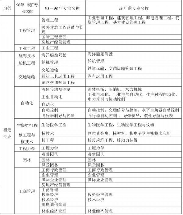 1、本表按教育部現行《普通高等學校本科專業目錄新舊專業對照表》編制,共涉及“土建類、測繪類、水利類、交通運輸類、能源動力類、地礦類、材料類、電氣信息類、機械類、管理科學與工程類、生物工程類、化工與制藥類、工程力學類”等18類45個專業,其中本專業36個,相近專業9個。