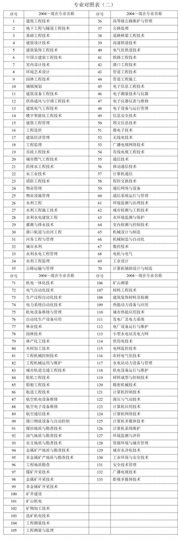 注:本表按教育部現行《普通高等學校高職高專教育指導性專業目錄(2005年版)》編制。共涉及“土建施工類、工程管理類、建筑設計類、城鎮規劃與管理類、建筑設備類、市政工程類、房地產類、水利工程與管理類、機械設計制造類、自動化類、電子信息類、通訊類、環保類、機電設備類、公路運輸類、鐵路運輸類、港口運輸類、管道運輸類、林業技術類、城市軌道運輸類、水上運輸類、民用運輸類、資源勘查類、水利水電設備類、地質工程與技術類、礦冶工程類、礦物加工類、測繪類、材料類、能源類、電力技術、計算機類、安全類、廣播影視類”等34類133個專業,其中本專業76個,相近專業57個。