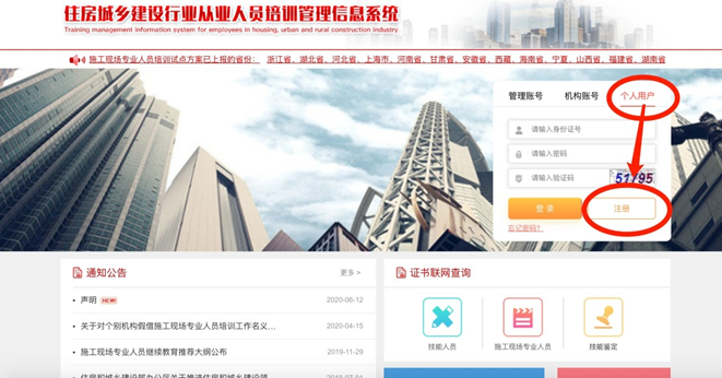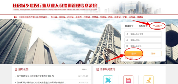使用電腦打開瀏覽器登錄住房和城鄉建設行業從業人員培訓管理信息系統(網址 http://rcgz.mohurd.gov.cn) 進行免費注冊,須使用市面主流瀏覽器,如谷歌或 360 瀏覽器并調至極速模式。學員請選擇個人用戶登錄端口,如圖所示: