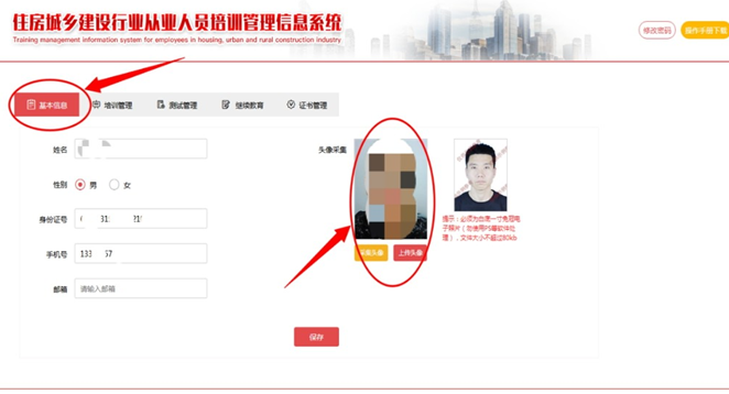 注冊成功進入系統后,請完善個人信息,上傳本人照片( 必須為本人近期一寸白底免冠照片, 文件大小不超過80KB),請確保本人照片無誤,一經上傳不可修改。在【證 書管理中】可查詢已經由建設行業行政主管部門上傳的有效證書,完成繼續教育后即可換發電子培訓合格證。