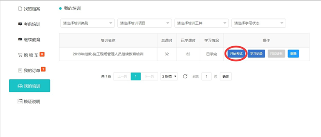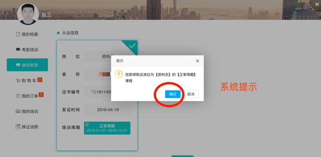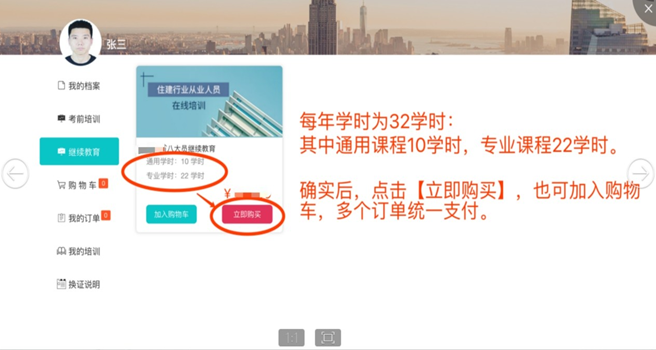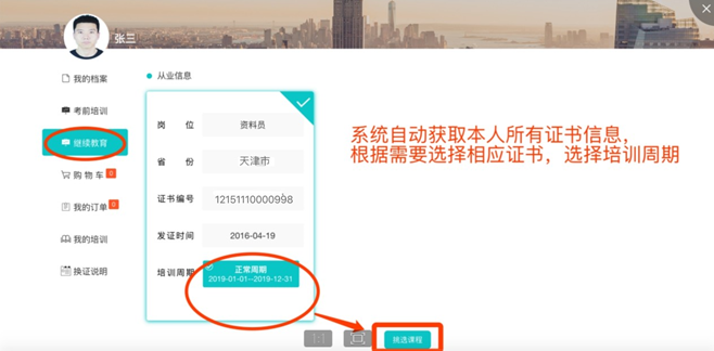 首次注冊成功后,系統自動跳轉到個人用戶頁面,將從部管理系統中下載本人已有證書信息,選擇需要進行繼續教育學習的證書后,進行提交,系統自動生成課程訂單。