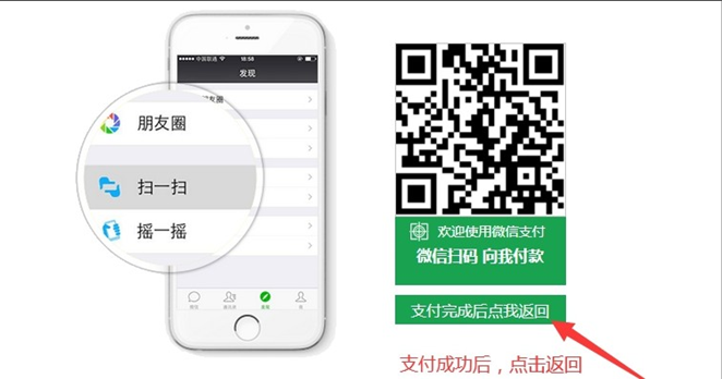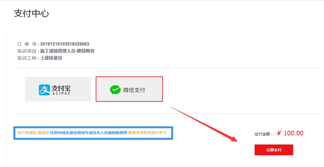 訂單生成后,點擊【立即購買】,頁面將跳轉到在線支 付頁面,可選擇【微信】或【支付寶】進行支付,在新頁面 掃描支付二維碼完成支付,支付成功后,系統提示將自動返回培訓網界面。(推薦使用微信支付)
