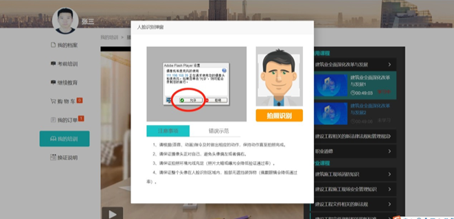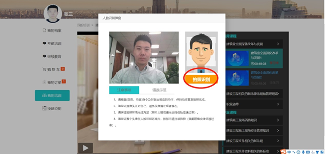 彈出攝像頭人臉識別框后學員本人將面部對準攝像頭, 點擊“拍照識別”,系統將進行動態面部識別,識別成功后自動跳轉學習界面進行學習,請務必保證本人信息真實,經核查系統抓拍照片,如發現替學情況,系統將進行學時清零, 需重新學習。
