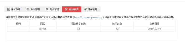 登錄住房和城鄉建設行業從業人員培訓管理信息系統(網址http://rcgz.mohurd.gov.cn),使用個人賬戶進行登錄,可在“繼續教育”中查看已計入的繼續教育學時記錄。