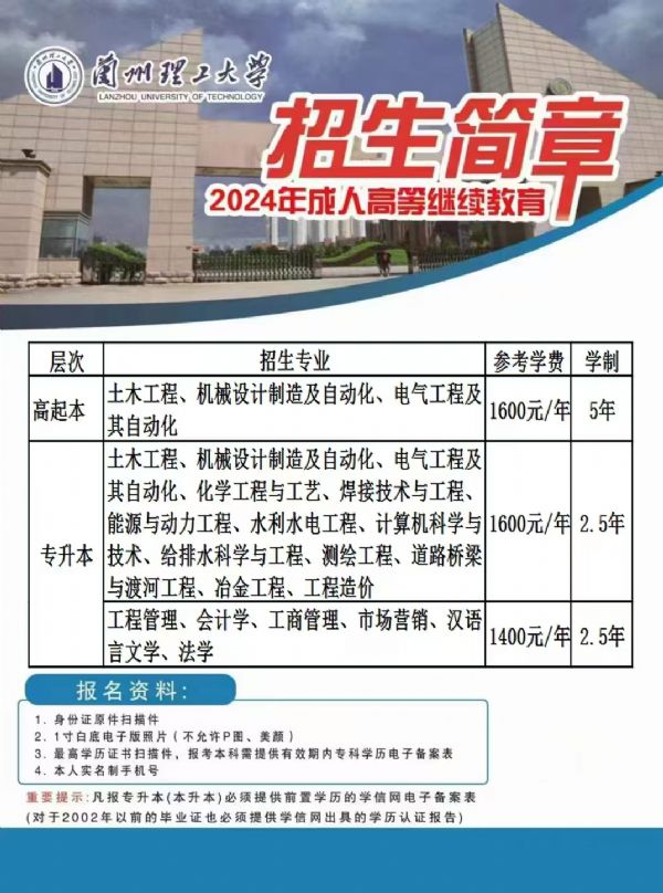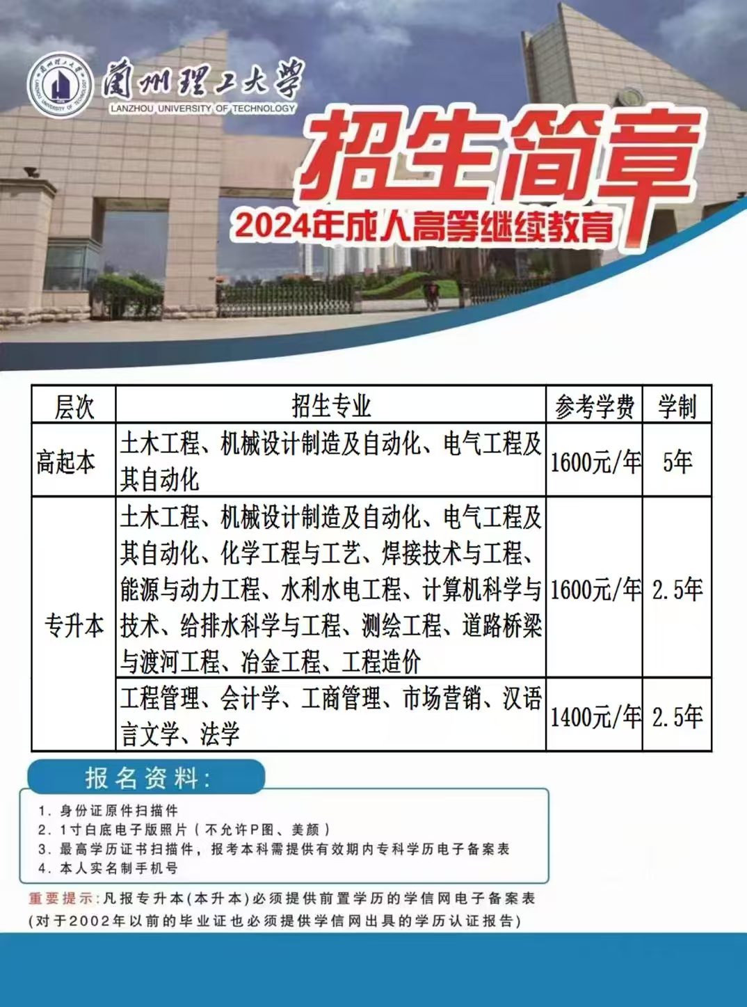 蘭州理工大學(xué)2024年高等學(xué)歷繼續(xù)教育招生簡(jiǎn)章